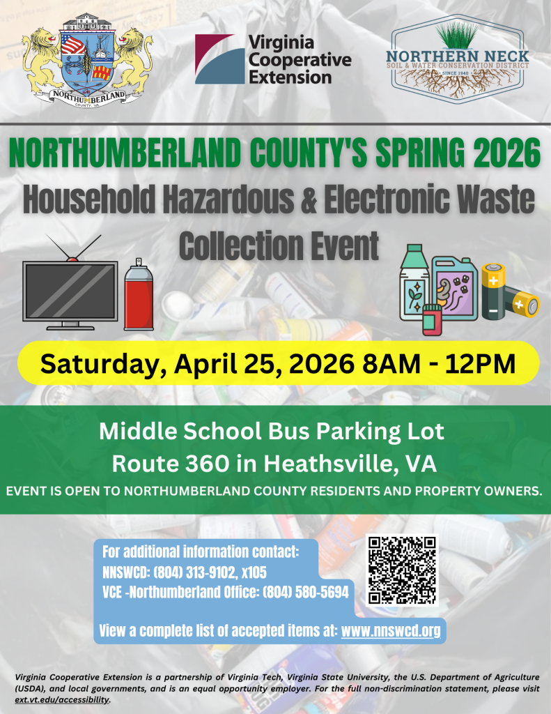 Please join us for the Northumberland County Spring 2026 Household Hazardous & Electronic Waste (HHW/E-Waste) Collection event on Saturday, April 11, 2026 from 8AM-12PM. This event will be held at the Middle School Bus parking lot located on Route 360 in Heathsville.